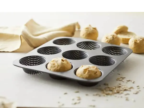 Bolleformen har huller, hvilket gør at dejen kan komme af med dampen under bagningen, og dermed bliver bollerne sprødere.
