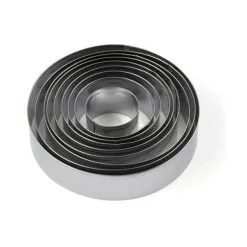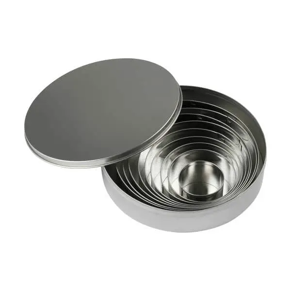 Med Blomsterbergs udstikkersæt får du 9 cirkelformede udstikkere i rustfrit stål i en fin metaldåse. Brug sættet til at udstikke små bunde til kager og desserter – fx bunde til medaljer eller marcipanskilte til dine kager. Størrelsen varierer fa 4-13 cm i diamter. Alle 9 udstikkere er 3 cm høje. Udstikkerne tåler fryser, ovn og opvaskemaskine.