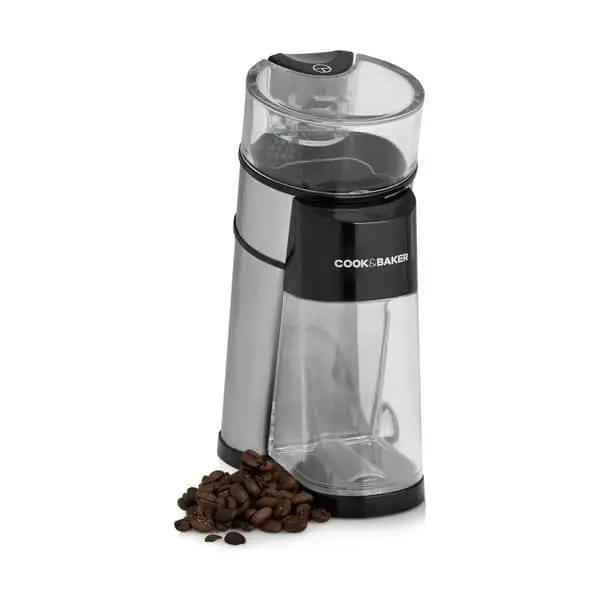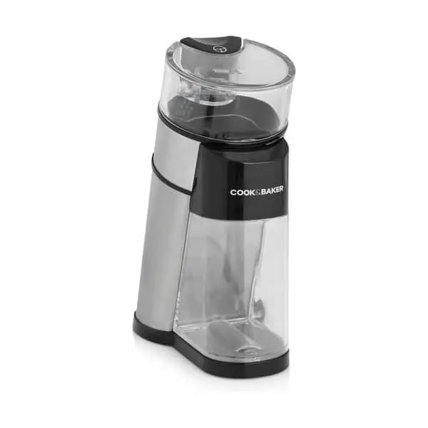 Cook & Baker kaffemøllen er produceret i børstet stål og har en motorkapacitet på 150 watt. Kaffemøllen kan rumme op til 60 gram kaffebønner.