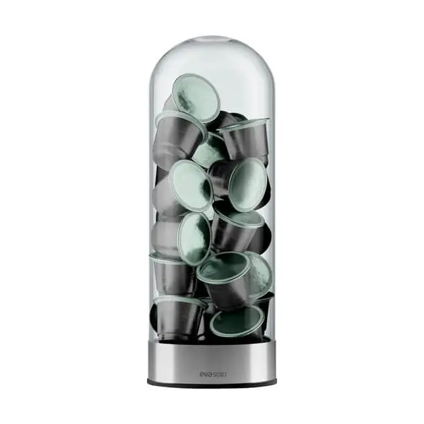 Det cylinderformede glas fra Eva Solo med silikone og rustfrit stål giver frit udsyn til de farverige kapsler. Bunden er forsynet med bløde silikonelapper, der holder kapslerne inde og som gør det nemt at løsne en enkelt kapsel ad gangen med fingrene. Kan rumme op til 25 kapsler.