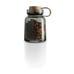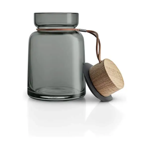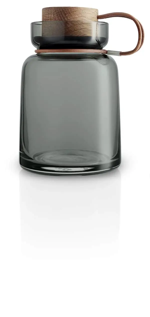 Opbevaringsglasset fra Eva Solo er god til opbevaring af alt fra rosiner til tørrede chilier. Glasser er mundblæst, og røgfarven beskytter mod sollys, så indholdets smag og farve bevares længere. Glassets låg giver nem og hurtig adgang til råvarerne og lukker helt tæt. Glasset tåler maskinopvask. Låg og læderstrop rengøres nemt med en opvredet klud.