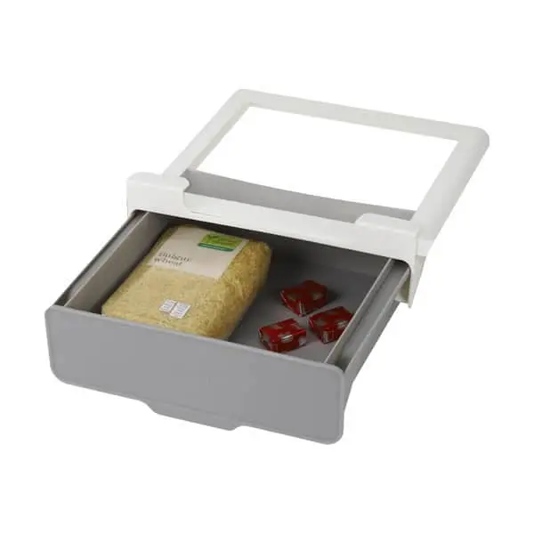 Opbevaringssystemet er niveauinddelt og har en praktisk skuffe, så du kan se dåser og krukker bagest i skabet og samtidig få nem adgang til småtingene i skuffen. Opbevaringssystemet har en kompakt størrelse og er derfor velegnet til skabe, der måler minimum 26 cm i dybden.