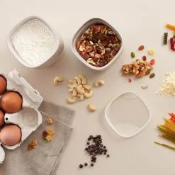 Beholderne er velegnede til opbevaring af tørfoder, salt, sukker, mel, nødder, frø og meget mere. Silikonelågde holder sig friske længere og forhindrer fugt i at komme ind i beholderen. Takket være de gennemsigtige sider og låg kan vi se, hvad der er indeni uden at åbne beholderen. Det medfølgende tilbehør, såsom en støvsi og et låg med hældeåbninger, er med til at tømme beholderne lettere