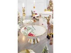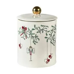 Julens godter serveres flot i stellet fra Medusa Copenhagen. Den lille krukke er dekoreret med dejlige tegninger af mistelten og julepynt, og toppen er gylden.