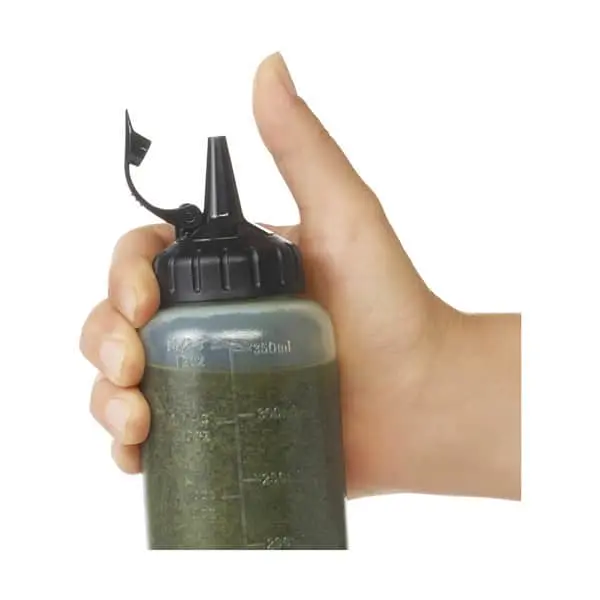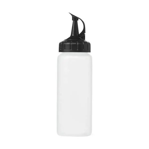 Flaskens låg forbliver åbent, mens du hælder, og det lukker helt tæt ved opbevaring og omrystning. Flasken fås i tre størrelser: 180 ml, 350 ml og 470 ml.