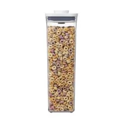 OXO POP Containers er en opbevaringsboks, som er perfekt til opbevaring af madvarer som eksempelvis mel, gryn, cornflakes, pasta, ris og lignende. Lukningen bliver lufttæt ved tryk på den store knap i låget. Knappen fungerer som håndtag, når du skal åbne boksen igen. Så nemt og simpelt.