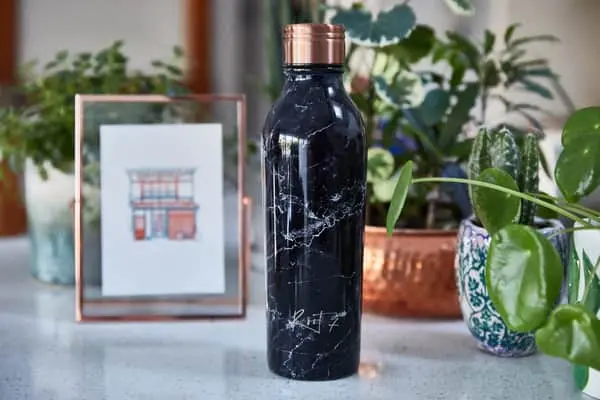 Flasken er lavet af rustfrit stål og har et mellemlag af termisk kobber, som giver en den gode isoleringsevne.