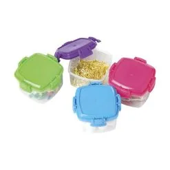 Knick Knack Pack Mini To Go består af fire små beholdere med låg i fire farver: lilla, pink, grøn og blå. Du kan fx bruge dem til rosiner og nødder, men de er også perfekte til at opbevare papirklips, elastikker eller perler.