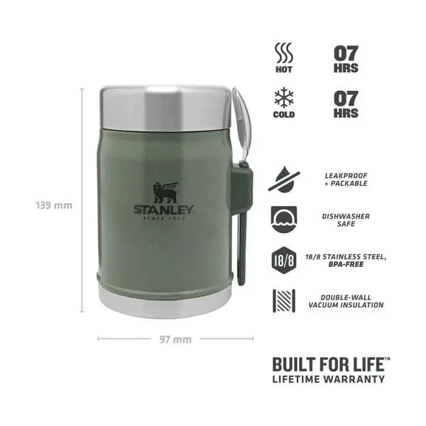 Denne madtermobeholder med tilhørende ske er en del af Stanleys Classic Series. Her finder du holdbare produkter, der er skabt til dig, der vil have godt kram med dig, når du er udendørs, på farten eller dyrker sport. Med denne beholder holdes din mad enten varm eller kold i op til 7 timer, og du kan nemt indtage maden med den tilhørende ske, der sidder fast på siden af beholderen.