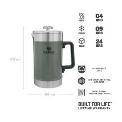 Denne stempeltermokande er en del af Stanleys Classic Series. Her finder du holdbare produkter, der er skabt til dig, der vil have godt kram med dig, når du er udendørs, på farten eller dyrker sport. Stempeltermokanden holder kaffen varm i op til 4 timer, men kan også holde kulde i 9 timer og iskoldt i 24 timer.