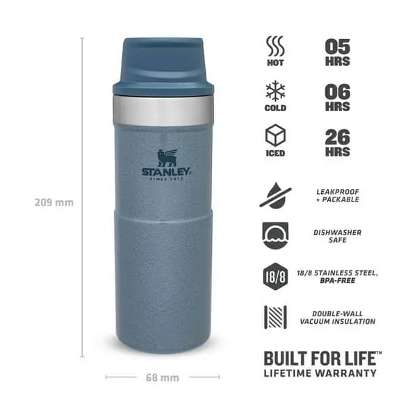 Denne termokop er en del af Stanleys Classic Series. Her finder du holdbare produkter, der er skabt til dig, der vil have godt kram med dig, når du er udendørs, på farten eller dyrker sport. Termokoppen her holder væsker varme i op til 5 timer, kolde væsker kolde i op til 6 timer og iskolde væsker iskolde i på til hele 26 timer.