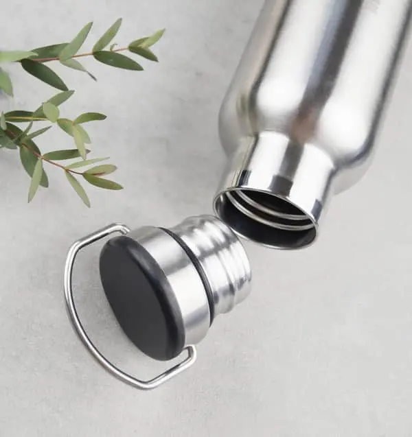 Produceret i holdbart rustfrit stål og med dobbelte vægge kan den klimavenlige drikkeflaske holde til det hele. Flasken har sort låg af bambus og er nem at gøre ren og fylde op på grund af den brede mund.